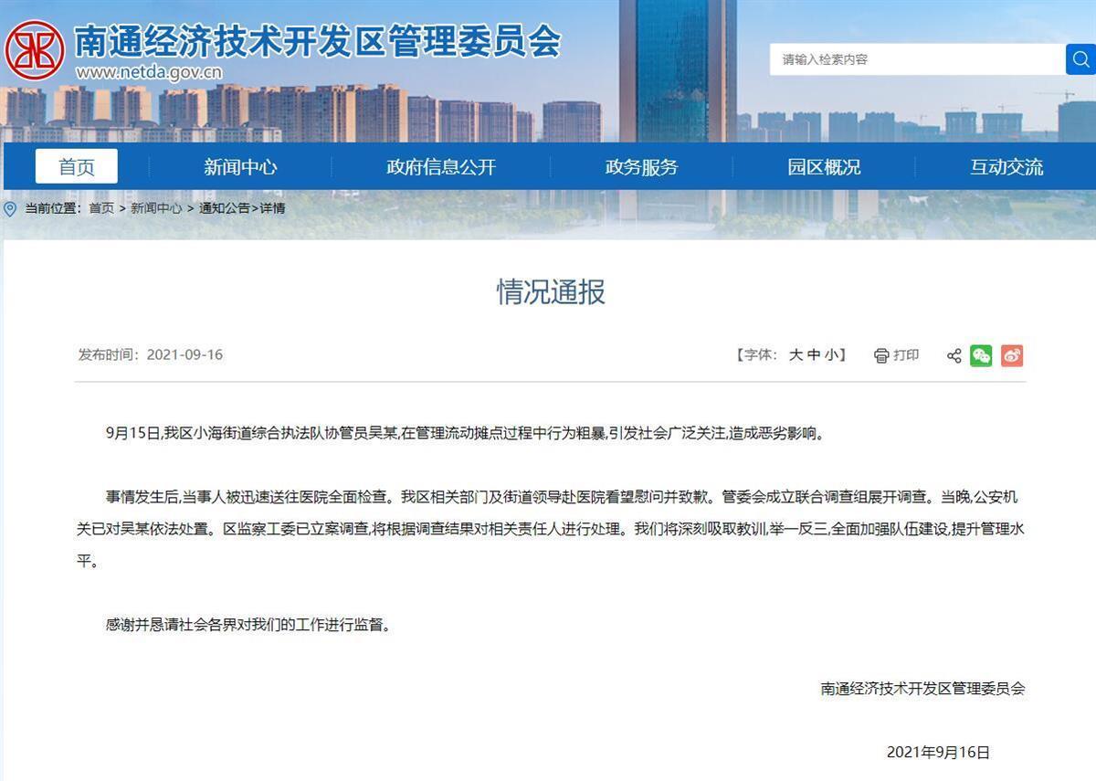 9月16日,南通经济技术开发区管委会通报:9月15日,开发区小海街道综合执法队协管员吴某,在管理流动摊点过程中行为粗暴,引发社会广泛关注,造成恶劣影响。