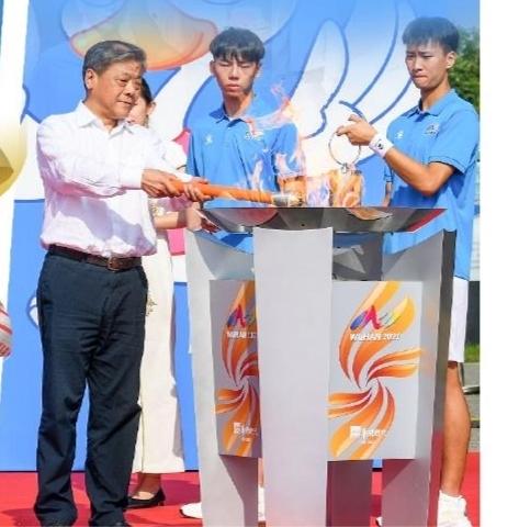 手持石斧的采火少女用引火棒点燃采火台的草堆,火苗腾跃,成功点燃火种灯。伴随着武汉市市运会会歌《奔涌》的激越节奏,火炬传递仪式同步开启。