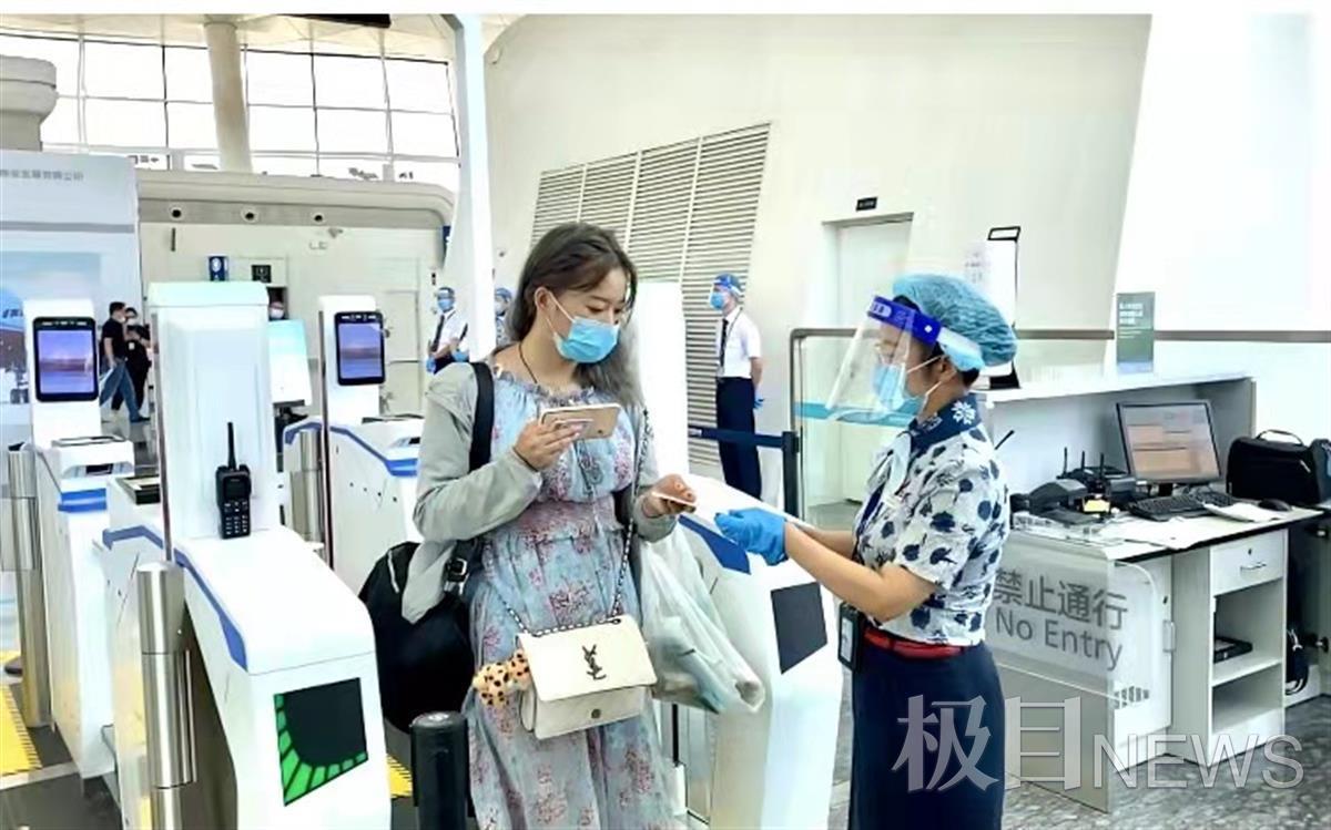 登机时,旅客在自助登机闸口前接受了手部消毒,再进入通道,将身份证放到指定的识别区域,识别成功后即可进入廊桥,整个过程就如同刷卡乘坐公交地铁一样轻松便捷。同时,也保留了绿色通道,老年旅客、特殊旅客、携带婴儿、儿童的旅客等都可以通过人工验票顺利登机。人工验票时,服务员也会提醒每一位旅客先在自助消毒机上完成手部消毒再进入廊桥。