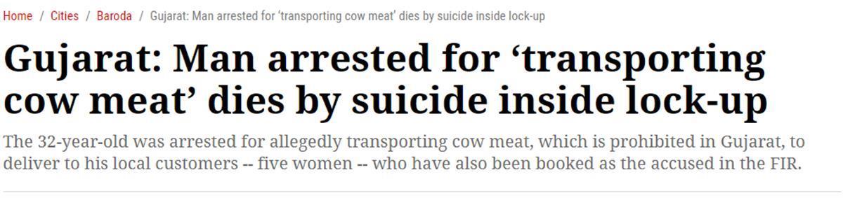 据《印度快报》报道,印度一名32岁的男子因涉嫌运送牛肉被警方逮捕后,于当地时间9月16日在监狱内自杀身亡。