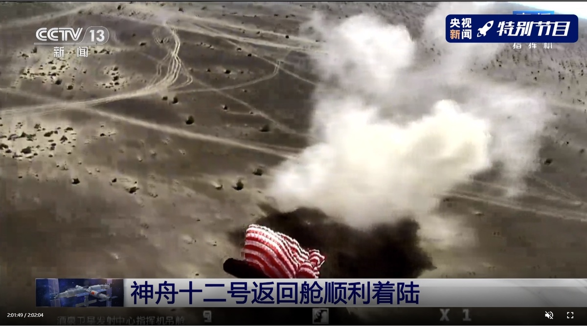 9月17日下午1时34分,神舟十二号载人飞船返回舱反推火箭成功点火后,平安降落在东风着陆场预定区域,成功着陆。