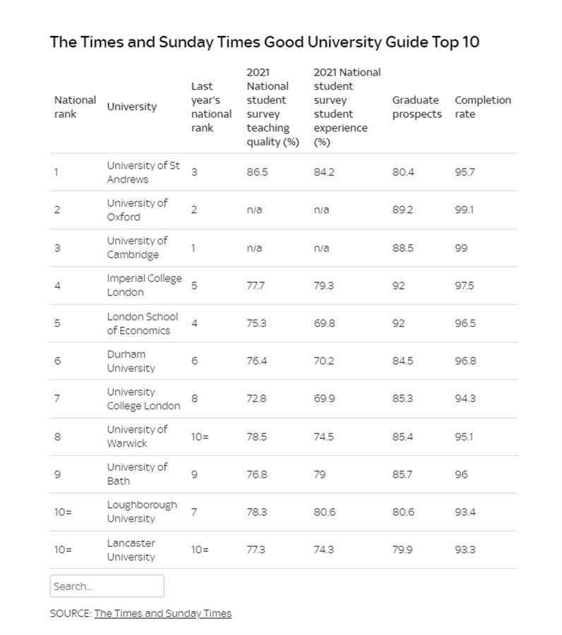 据天空新闻网报道,《泰晤士报》和《星期日泰晤士报》历来有制作英国《优秀大学指南》的传统,30年间,榜首都是牛津和剑桥轮流“坐庄”。