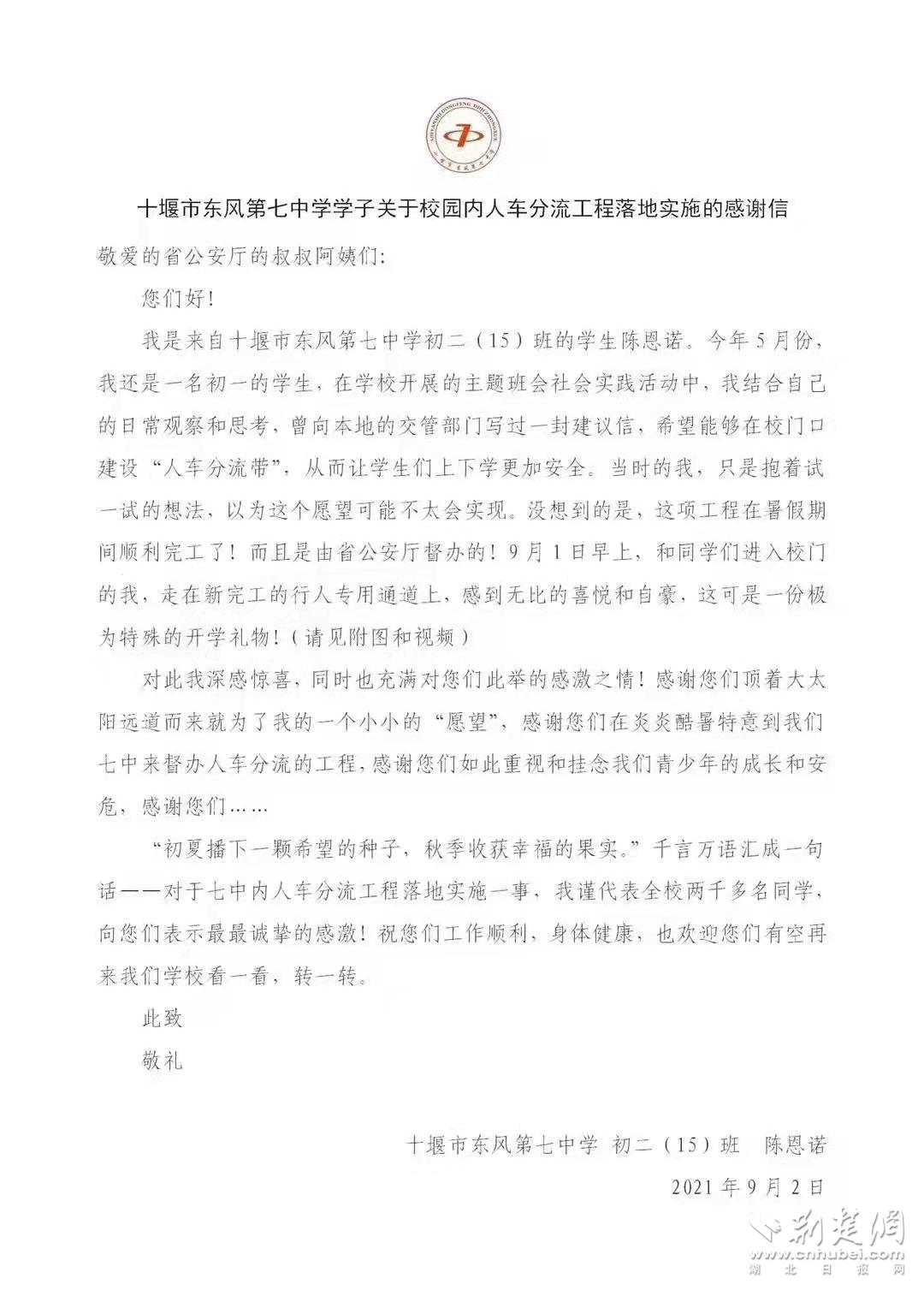 荆楚网(湖北日报网)讯(记者 张扬) “感谢您们如此重视和挂念青少年的成长和安危,让我们的小小愿望变为了现实......”近日,湖北省公安厅治安总队户政基础支队一级高级警长杨怡收到十堰市东风第七中学学生送来的感谢信,感谢她协同相关职能部门完成校门口交通要道“人车分流带”建设,保障学生上下学安全,为他们送上了一份开学大礼。