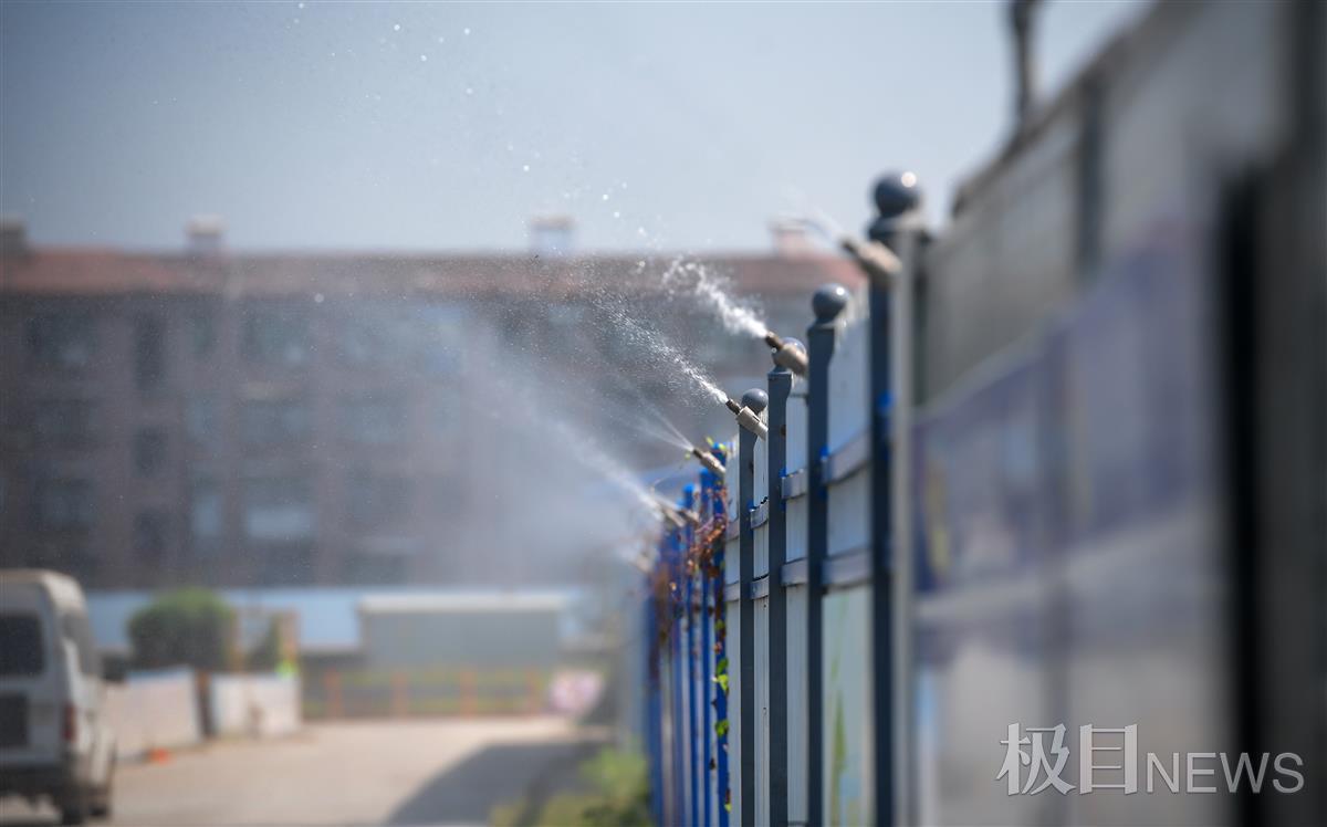 9月16日上午,极目新闻记者来到武汉市东西湖区第三人民医院综合大楼项目工地,只见路面干净整洁,物料建材整齐堆放在物料区,道路一旁每间隔几米安置着自动喷水装置,不时向道路喷水降尘。