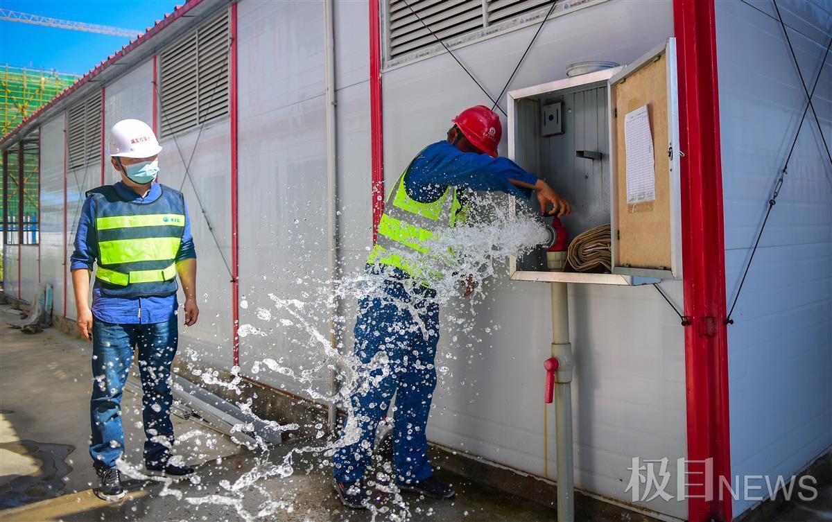 蒙跃与同事随机打开工地上的一个消防柜,拧开消防栓,水流立即从中涌出。“检查合格。”蒙跃说。