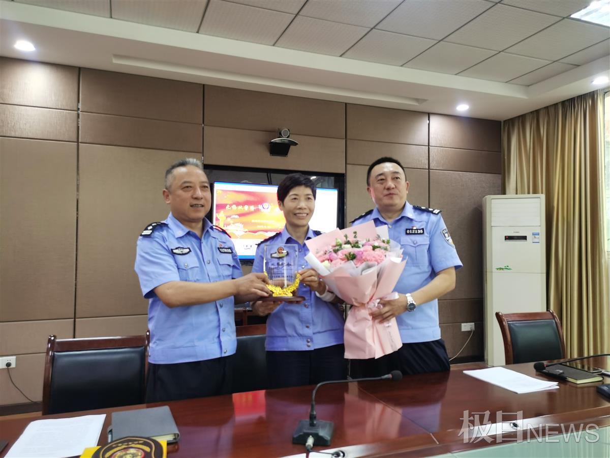 欢送会上,江北派出所为颜琳颁发了公安荣休纪念章和从警纪念水晶座。同事们为颜琳送上了鲜花和亲手包装的礼物。