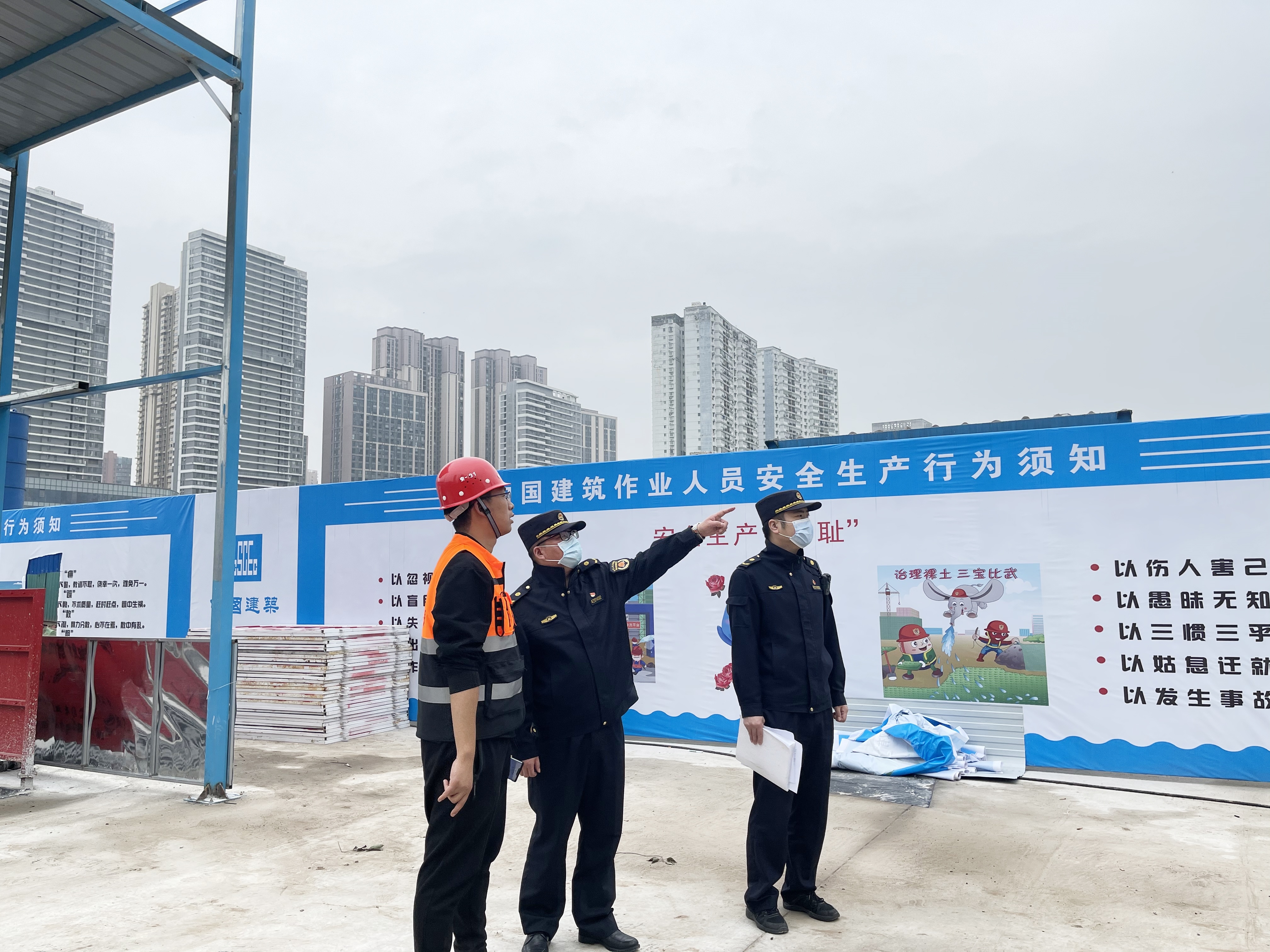 城管队员指导工地降噪