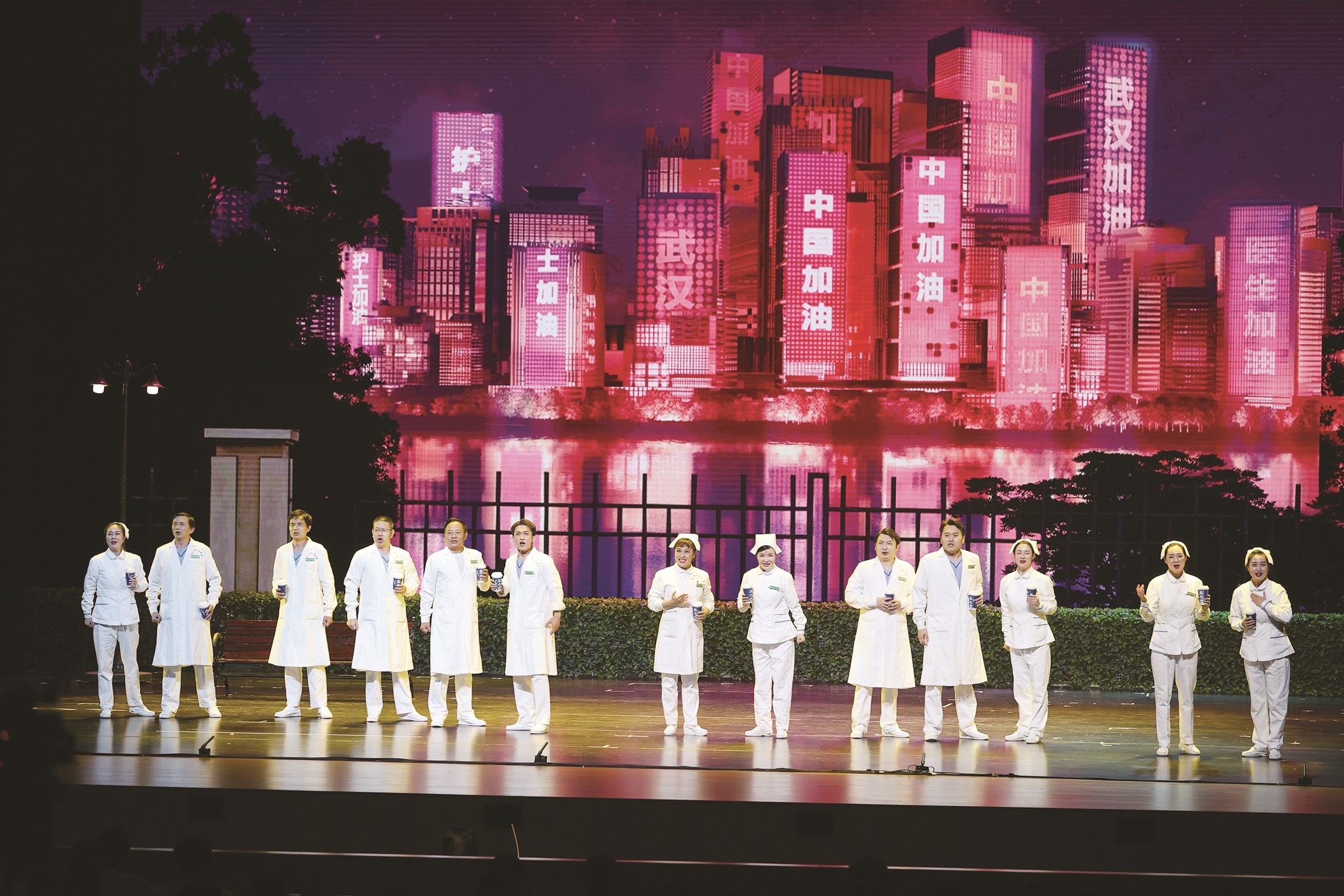 “来不及悲伤,顾不上多想,我们是战士,战斗在前方!”步步惊心的音乐,极致炫目的灯光,如临大敌的场景,让舞台上的“医护人员”脸上再添几分焦灼,也将台下观众的记忆拉回到2020年1月底的难忘时刻。