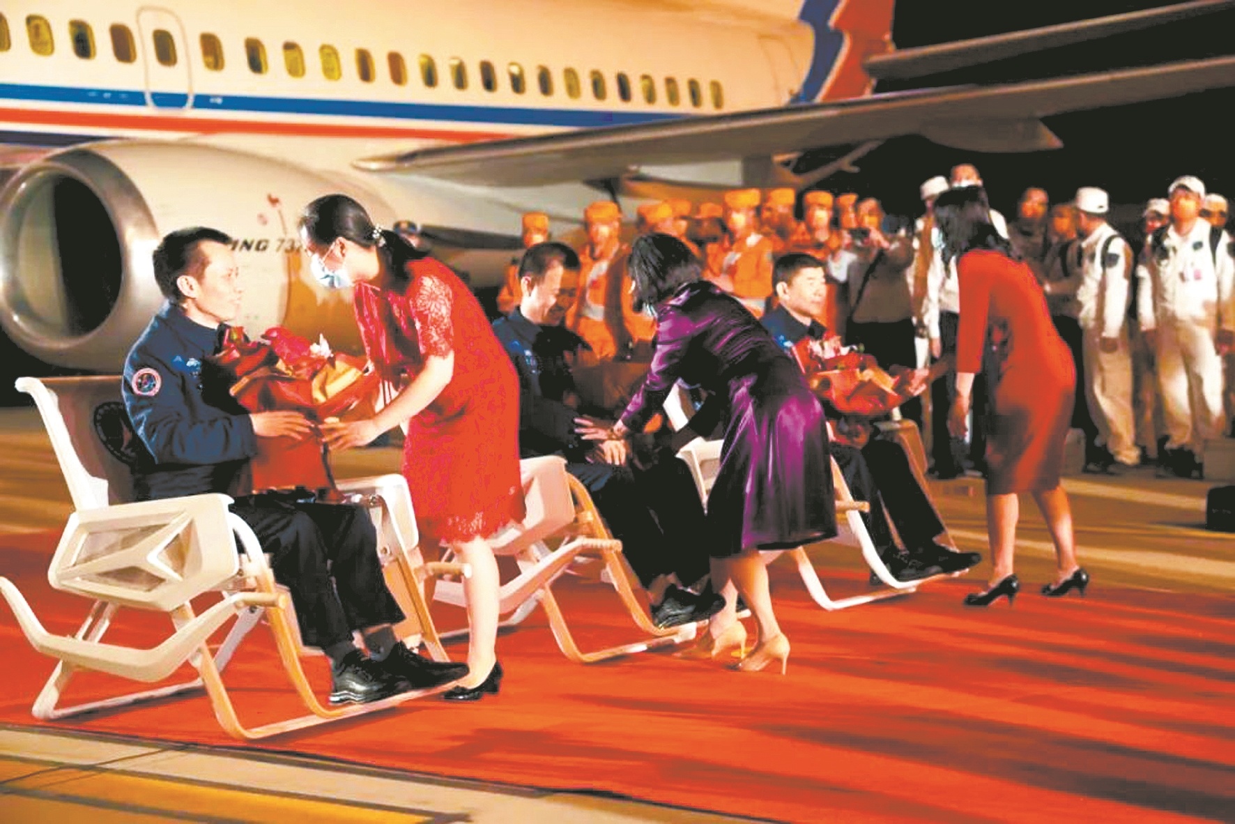 昨日,3名航天员乘飞机抵达北京,家属向他们献花