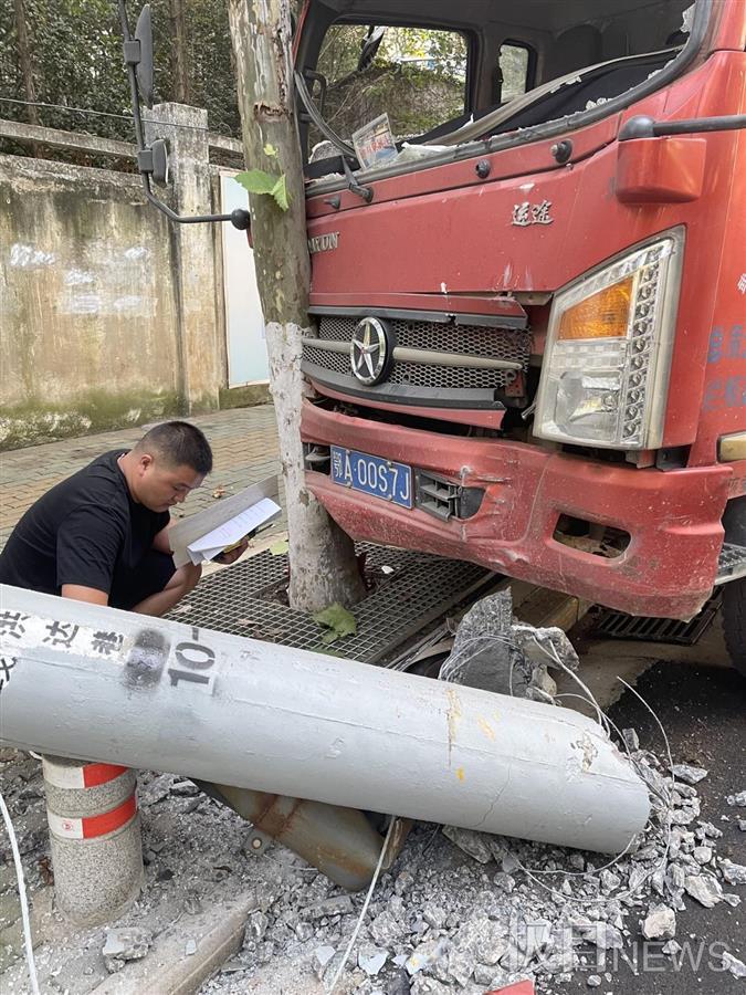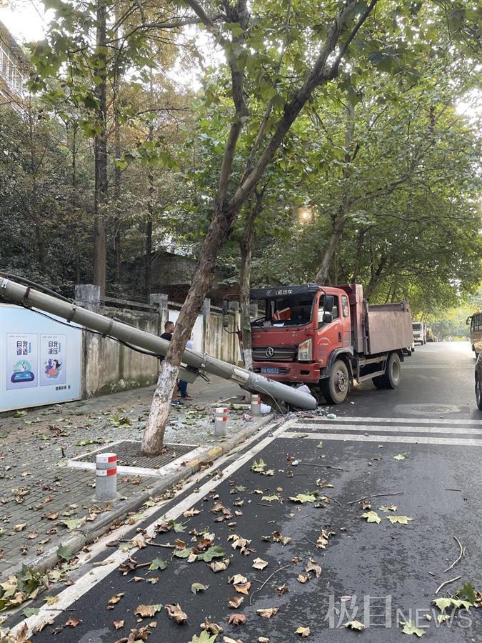 9月18日,武汉市洪山区洪达巷的一家超市老板俞先生正在店内理货。突然,他听到了一声巨响,出门一看,才发现是一辆货车撞倒了路边的电线杆。