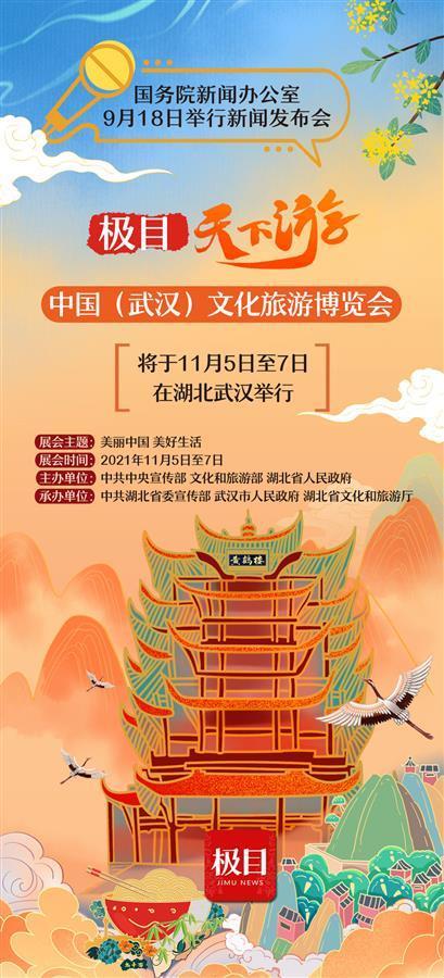 国务院新闻办公室2021年9月18日下午举行新闻发布会,中央宣传部副秘书长郭义强、 文化和旅游部党组成员王晓峰、湖北省副省长张文兵、武汉市副市长江伟,介绍首届中国(武汉)文化旅游博览会有关情况,并答记者问。极目新闻记者现场采访获悉,首届中国(武汉)文化旅游博览会由中共中央宣传部、文化和旅游部、湖北省人民政府主办,由中共湖北省委宣传部、武汉市人民政府、湖北省文化和旅游厅承办,定于11月5日至11月7日在湖北武汉举行,展会主题为“美丽中国 美好生活”。