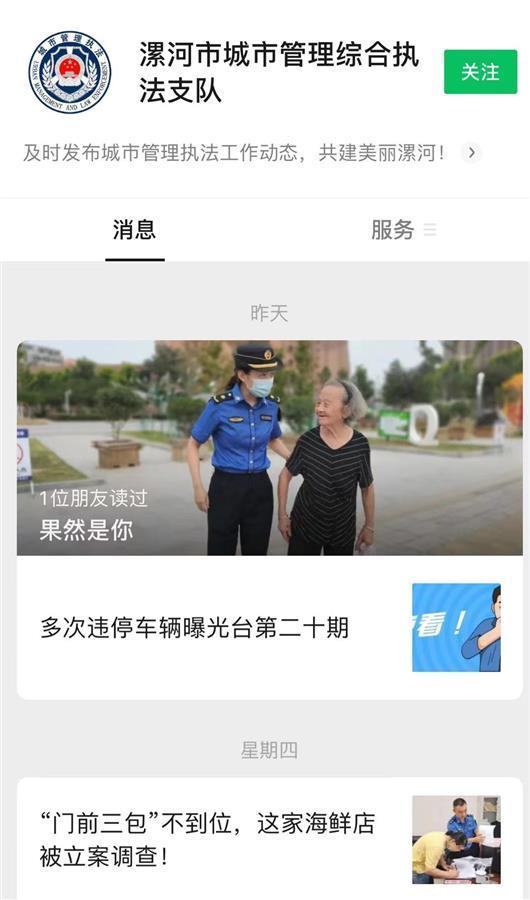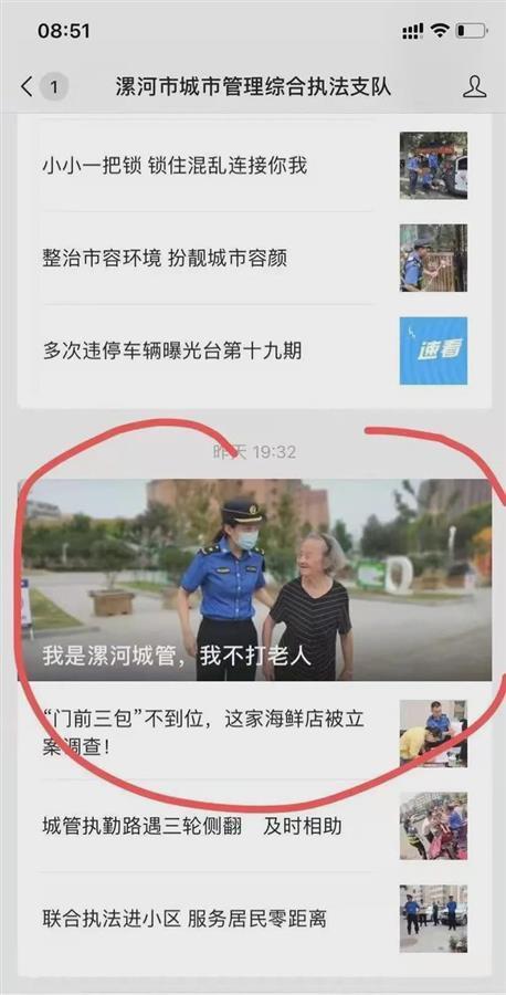 记者在漯河市城市管理综合执法支队微信公众号看到,9月17日,该公众号重新发了一篇文章《果然是你》,配图与被删除的《我是漯河城管,我不打老人》一样,均为身穿城管制服的工作人员扶着一位老太太。《果然是你》讲述了漯河经开大队城管队员一路辗转,费尽周折,终于将一位迷路的耄耋老人安全地送回家中的事情。