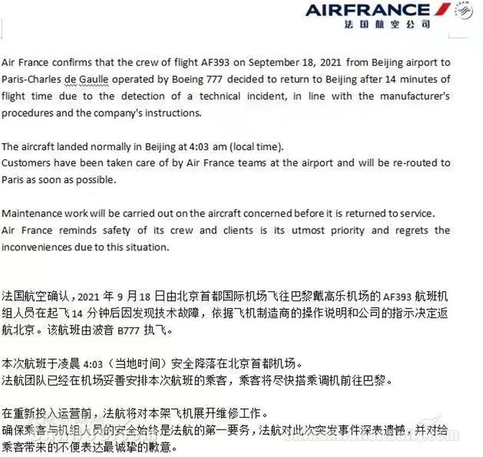 对此,法航回应称,2021年9月18日,由北京首都国际机场飞往巴黎戴高乐机场的AF393航班机组人员在起飞14分钟后,因发现技术故障,依据飞机制造商的操作说明和公司的指示决定返航北京。该航班由波音B777执飞。本次航班于凌晨4:03(当地时间)安全降落在北京首都机场。法航团队已经在机场妥善安排本次航班的乘客,乘客将尽快搭乘调机前往巴黎。