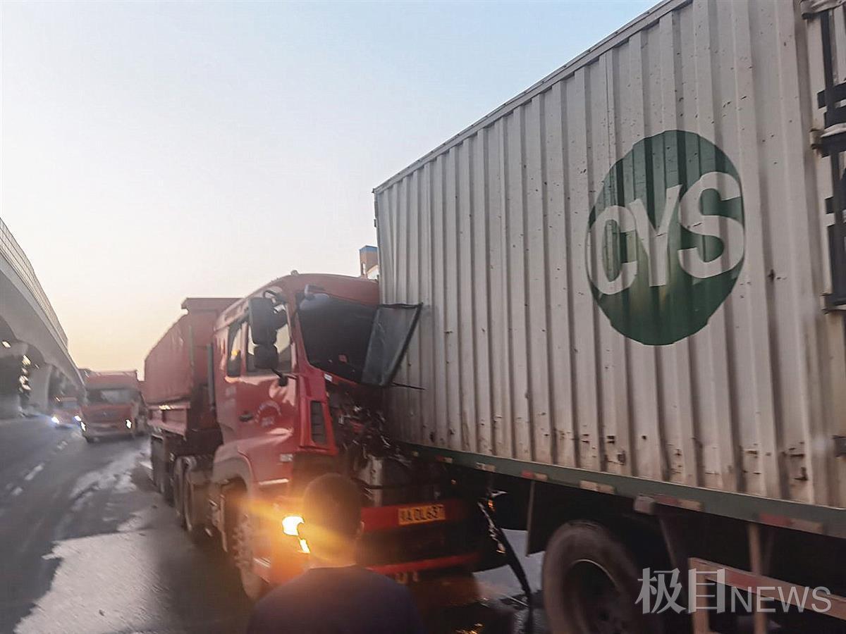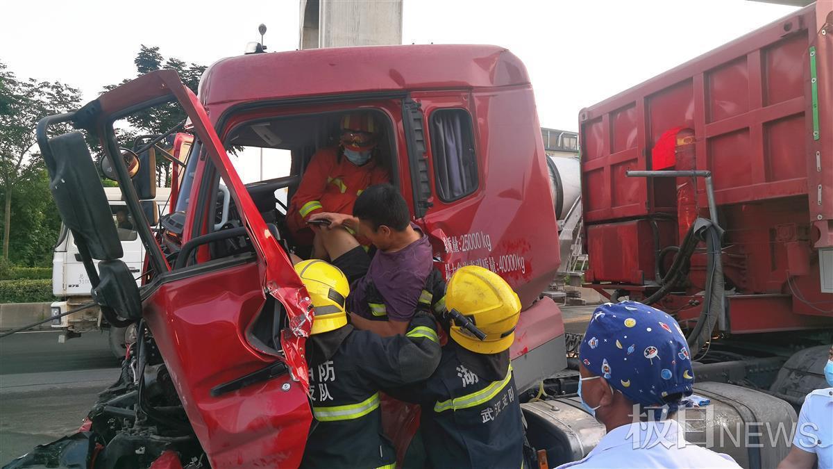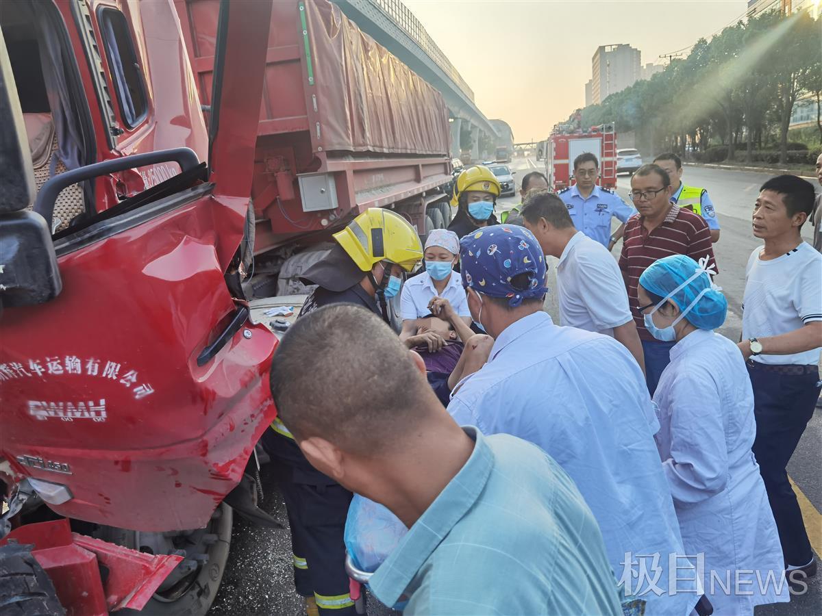 9月18日清晨5时48分许,湖北武汉市新洲区汉施公路阳逻轻轨站旁,发生一起货车追尾交通事故,造成后车司机被困车内,无法脱困。武汉消防119指挥中心接警后,立即调派阳逻站消防员赶赴现场施救。