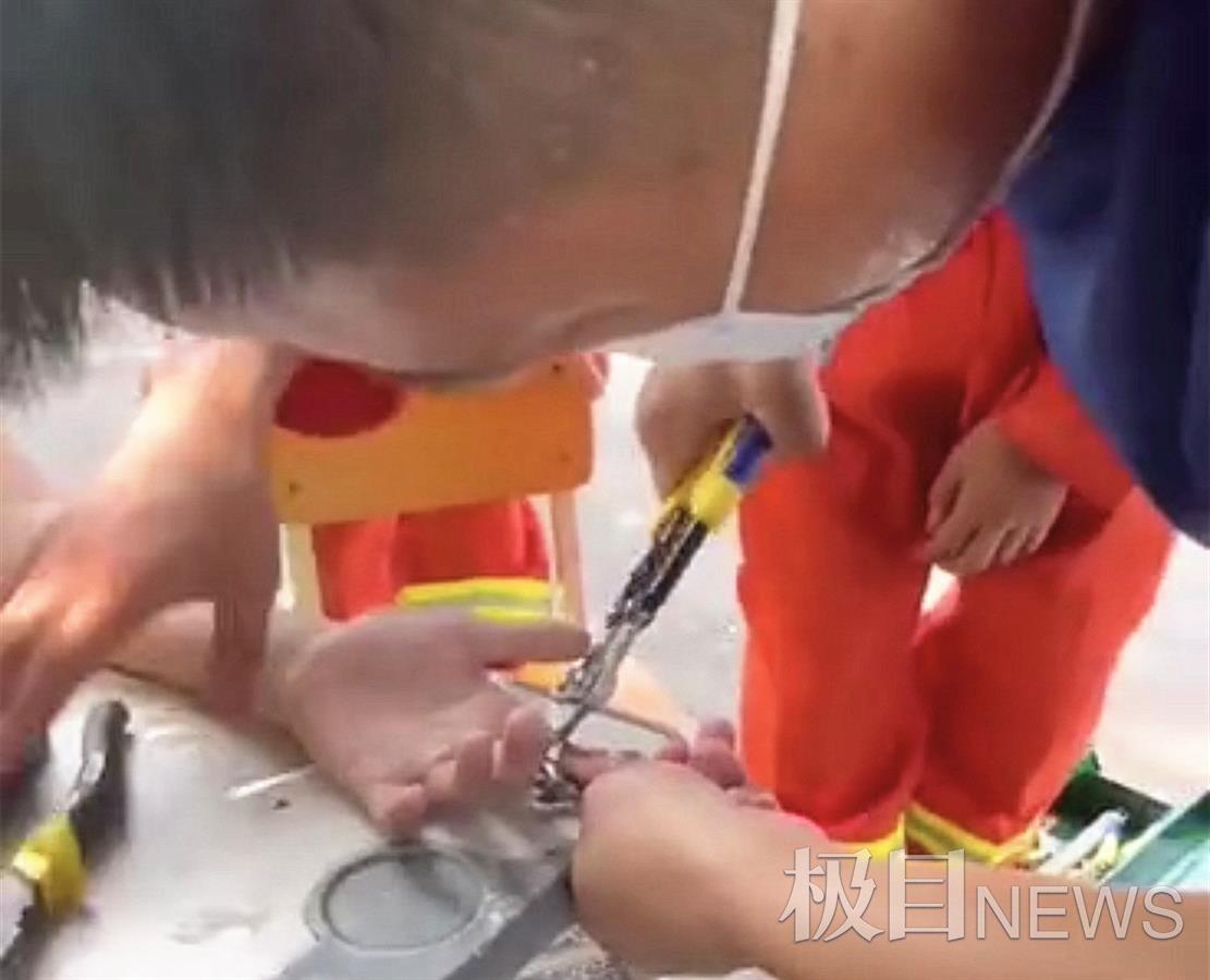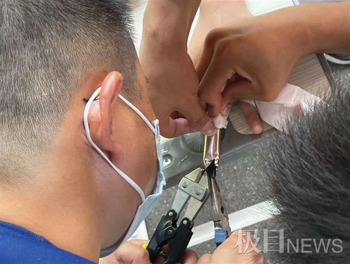 消防员到达现场时,只见一学生手指卡在扫把铁管内,手指伴有轻微肿胀、少量流血。见此情形,消防指挥员立即下令利用剪扩器、老虎钳等工具施救。消防员先找来剪扩器先将扫把铁管剪短,随后从底部用老虎钳、螺丝刀一点点慢慢将铁管撕开,再取适量肥皂泡沫涂抹被卡手指,用老虎钳将手指被卡的周边区域一点点剪开,尽量避免造成二次伤害。经过半小时细心作业,学生手指成功从铁管内取出。