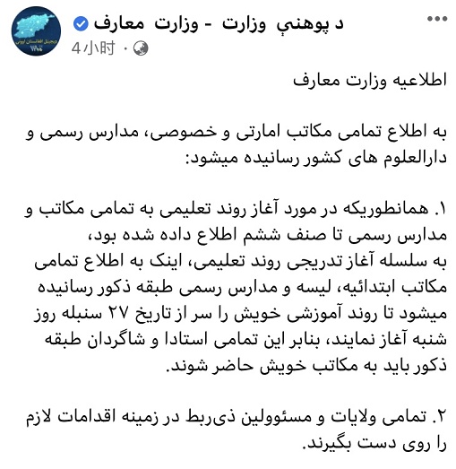 当地时间9月17日,阿富汗临时政府教育部在社交媒体上发表声明,宣布阿富汗中小学校将于9月18日重新开放。