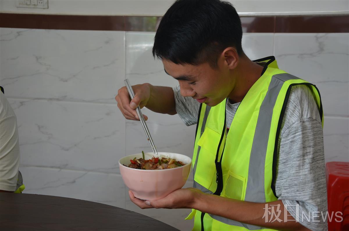 入夏以后,工地调整了作息时间,充分利用早上和下午时间施工。上午十时许,工人食堂已经开始准备饭菜,极目新闻记者注意到,除了荤素搭配不重样之外,在主食方面准备了米饭、馒头、饼三种,满足不同地域工人们的口味。11时左右,陆续有工人收工,来到食堂,从餐柜里取出自己的餐具,排队打饭。今年38岁的尚彦军来自河北,有20年铁路一线施工经历,多年来辗转云南、内蒙古、湖北多地,在“黄黄铁路”项目担任二分部一工区经理。他盛了一大碗米饭,说:“食堂里,鸡鸭鱼排骨换着做,老家习惯吃面食,多年在外已经习惯吃米饭了。”