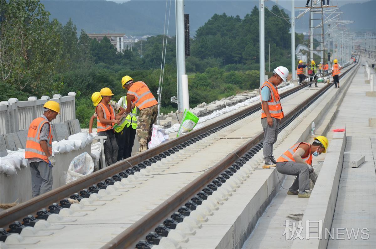 近日,在中铁十一局集团“黄黄铁路”4标段项目黄梅县的施工现场,极目新闻记者在桥梁上看到,铁路的桥梁工程、路基工程的主体以及铺轨已经完成,烈日下,工人们身着反光背心,头戴安全帽,正在进行剩余工程的施工。