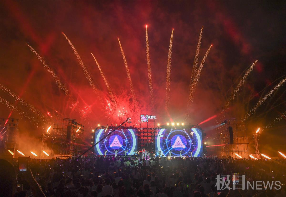 极目新闻记者在现场看到,与传统的“一放到底”烟花秀不同,主题为“焰遇花博汇之金秋花月夜”的焰火晚会,将焰火燃放融合于舞台表演,让国风雅韵与科幻世界通过焰火剧场完美融合,呈现焰火、圆月同框的美景,给现场观众带来别有风味的体验。