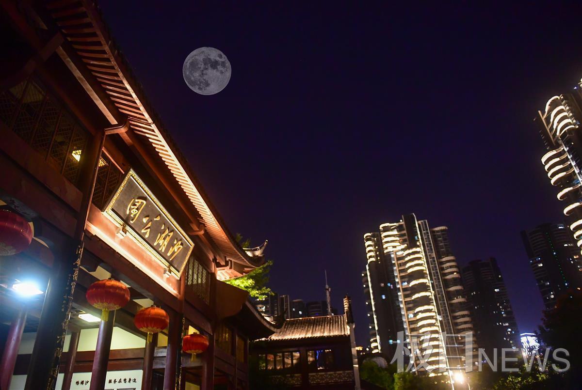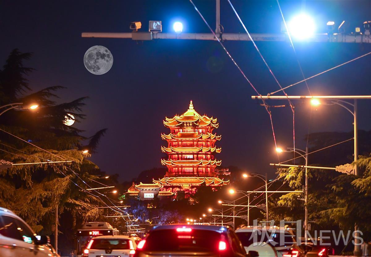 9月21日,农历八月十五是传统中秋佳节,晚上7:30分左右,黄鹤楼上空升起一轮明月,将黄鹤楼装扮得靓丽无比。