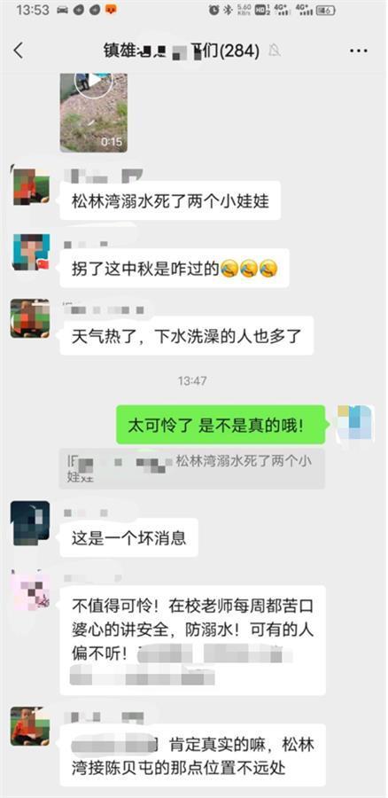 9月21日,有消息称,云南省镇雄县两名小孩在河中游泳,不幸溺亡。极目新闻记者从网传微信群聊截图看到,有当地网友称事情发生在镇雄县松林湾,两名小孩疑因天气炎热下水游泳,不幸遇难。