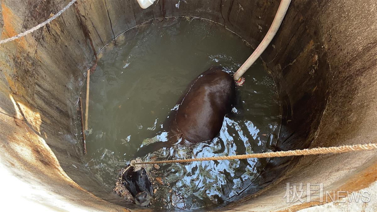 9时10分,消防人员赶到现场发现:一头老黄牛掉入村民家中15米深的蓄水井中。水井口直径约2.5米宽,水井里有水,黄牛浮在水面,距离井口约5米高,井内为不规则圆柱形,井内壁采用砖石堆砌而成,井口有一半砌进墙里......老黄牛掉进去已有一个多小时。