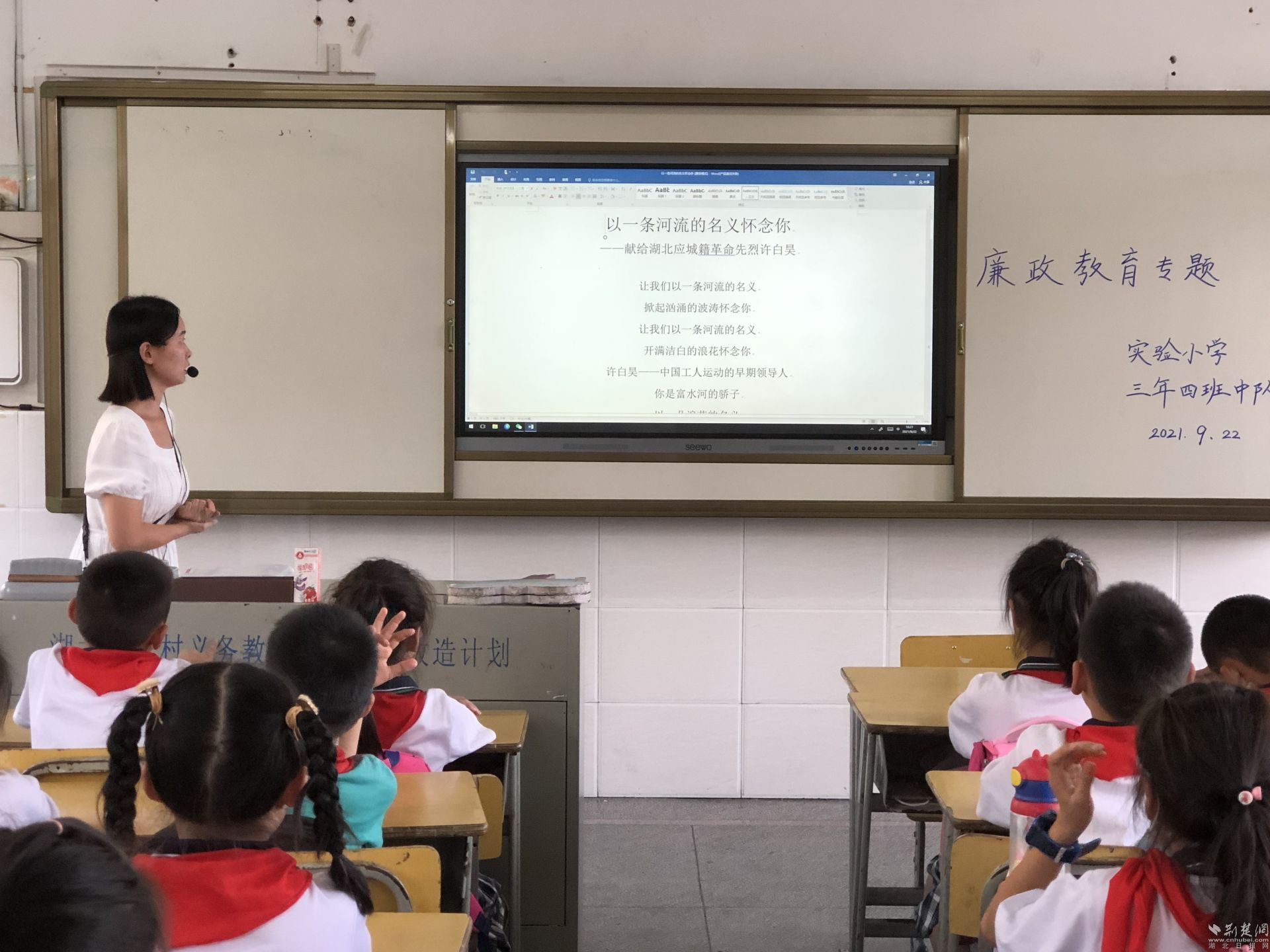 荆楚网(湖北日报网)讯(通讯员程国辉、彭阿梅)9月22日,应城市实验小学各班班队会上,书声琅琅,学生以饱满热情,深情朗诵诗歌——《以一条河流的名义怀念你》,表达对许白昊烈士的缅怀之情。