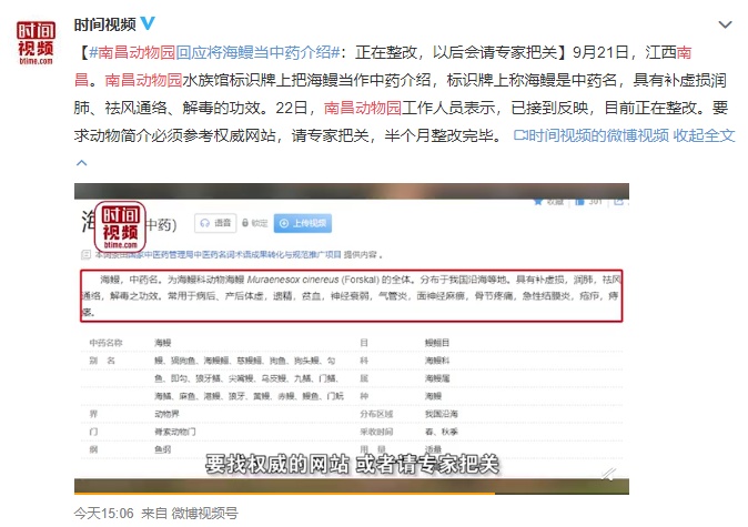 【南昌动物园回应将海鳗当中药介绍:正在整改,以后会请专家把关】9月21日,江西南昌。南昌动物园水族馆标识牌上把海鳗当作中药介绍,标识牌上称海鳗是中药名,具有补虚损、润肺、祛风通络、解毒的功效。22日,南昌动物园工作人员表示,已接到反映,目前正在整改。要求动物简介必须参考权威网站,请专家把关,半个月整改完毕。