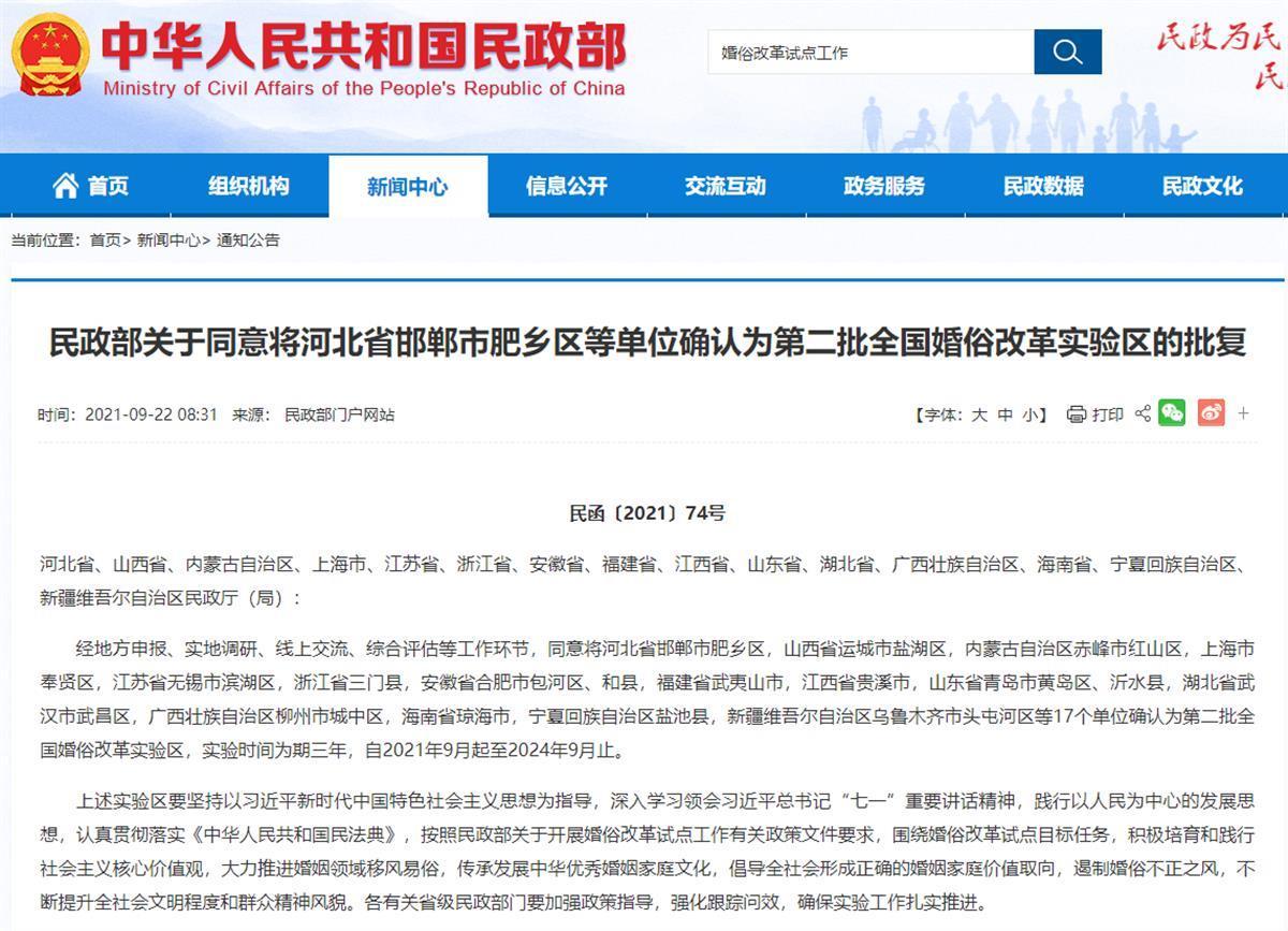 极目新闻记者注意到,民政部网站资料显示,2021年4月,河北省河间市,内蒙古自治区包头市青山区、乌兰察布市集宁区,辽宁省沈阳市皇姑区,吉林省永吉县,黑龙江省哈尔滨市南岗区,江苏省南京市建邺区、东台市,河南省开封市禹王台区、宁陵县,湖南省澧县,广东省广州市,重庆市大足区,四川省成都市武侯区,陕西省宝鸡市金台区等15个单位确认为全国婚俗改革实验区,实验时间为期三年。