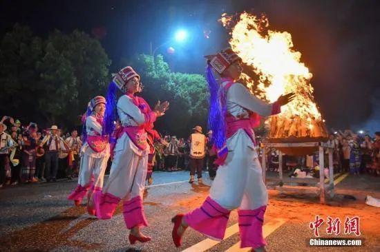 资料图:云南省石林彝族自治县举办火把狂欢节,上万名游客和当地民众一起点起火把,围着篝火载歌载舞,度过有“东方狂欢节”之称的火把节。中新社记者 任东 摄