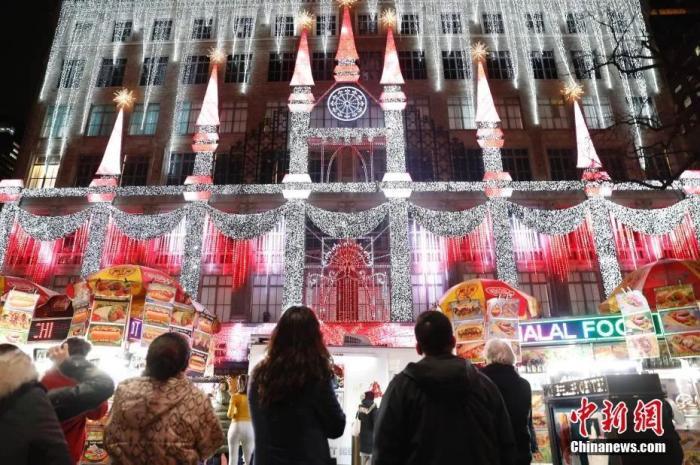 资料图:美国传统节日感恩节,纽约第五大道一家商场布置节日灯光秀吸引民众驻足观看。中新社记者 廖攀 摄