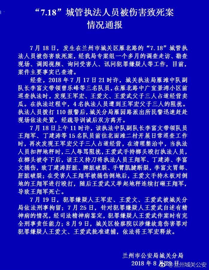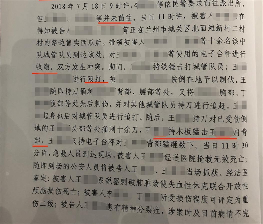 三年前,甘肃兰州的“瓜农刺死城管”事件,曾引发社会各界关注。该事件造成当地三名城管执法人员一死二伤,卖瓜的两兄弟王某文和王某武,也被刑事拘留至今。