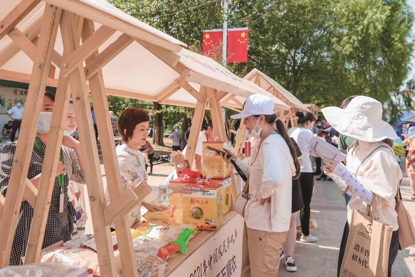 昨日上午,石榴红村成了一片欢乐的海洋,丰收节的活动现场搭建了丰收集市,展出武汉市6大新城区琳琅满目的标志性农产品。市集上最引人注目的莫过于城市伴手礼,主办单位武汉市供销社通过网络,评选出了30家优秀的城市伴手礼企业,他们带着自己的农产品,搭建起自己的展区,充分地展示了能代表武汉的特色礼品。