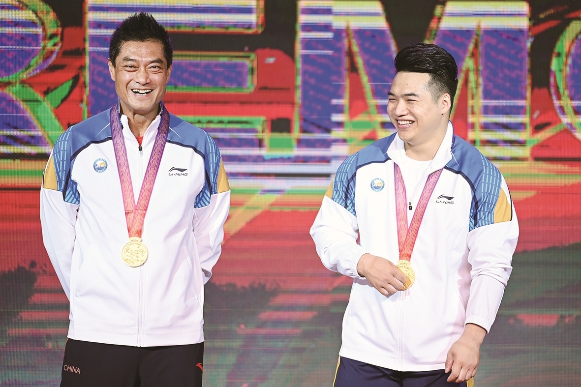 田涛(右)和教练于杰在颁奖仪式上