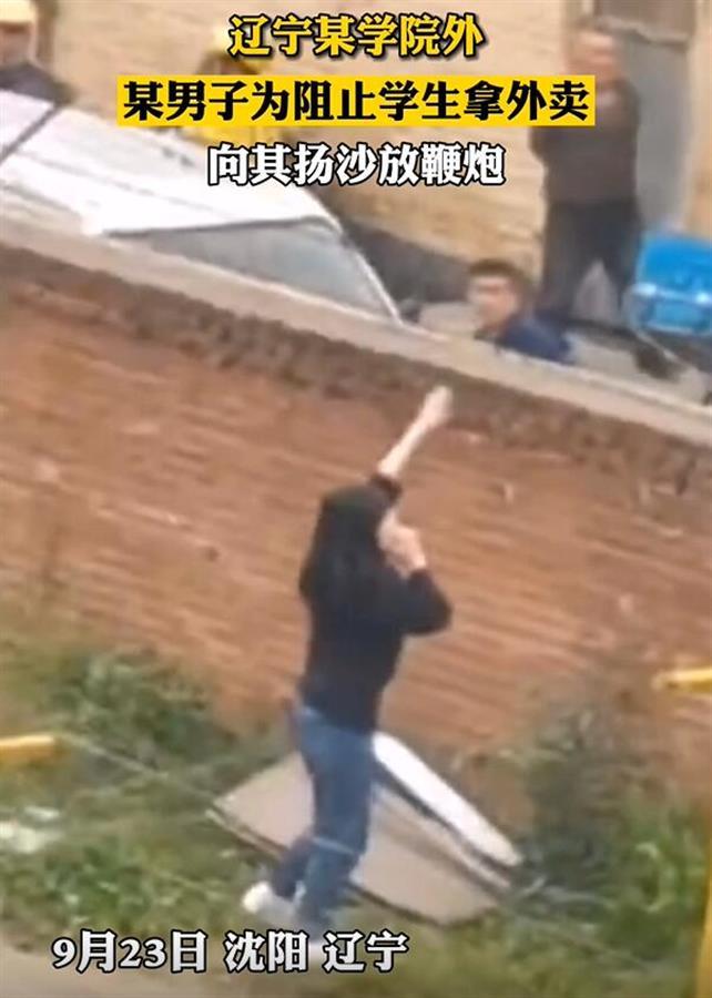 9月23日,辽宁一高校外,一名男子为阻止学生拿外卖,向他们扬沙放鞭炮的视频引发网友质疑。9月24日,校方回应极目新闻记者称,此人并非是校内人员,而是学校附近的居民。目前学校已经报警,在等警方的处理结果。