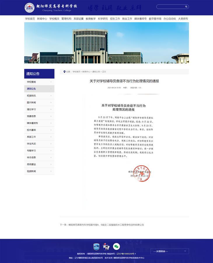 上述工作人员还发来一份《关于对学校辅导员查寝不当行为处理情况的通报》,通报称9月23日下午,网络平台上出现“朝阳师专辅导员疑似力查寝”短视频后,学校立即展开调查。经查,9月22日,初等教育系通知要求全系开展宿舍卫生大扫除,9月23日,辅导员谢某在检查宿含过程中存有失当行为。事后,该辅导员向学生赔礼道歉并取得谅解。