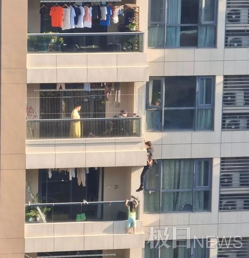很快,警方将12楼住户家防护网破出了一个洞口。辅警汤文杰是在场警力当中相对瘦小灵活的,又是部队特战旅的侦察兵出身,他当机立断将救援腰带和静力绳绑在了自己的腰部,其余警力则在室内帮其紧紧拉住静力绳。