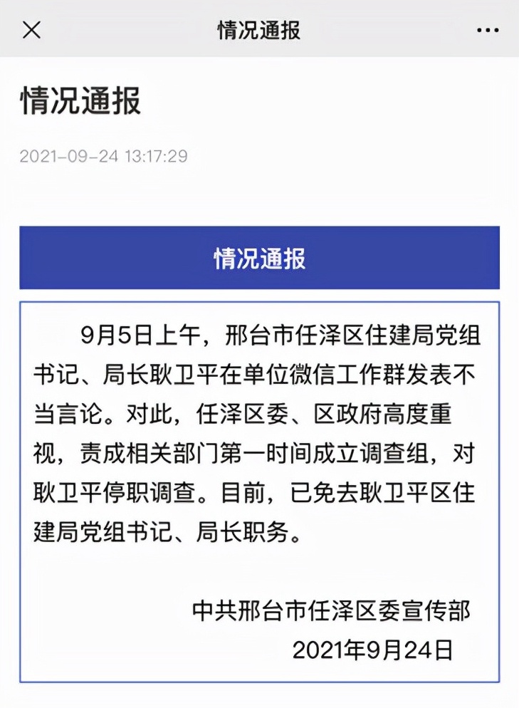 24日,邢台任泽区委宣传部发出官方通报:9月5日上午,邢台市任泽区住建局党组书记、局长耿卫平在单位微信工作群发表不当言论。对此,任泽区委、区政府高度重视,责成相关部门第一时间成立调查组,对耿卫平停职调查。目前,已免去耿卫平区住建局党组书记、局长职务。