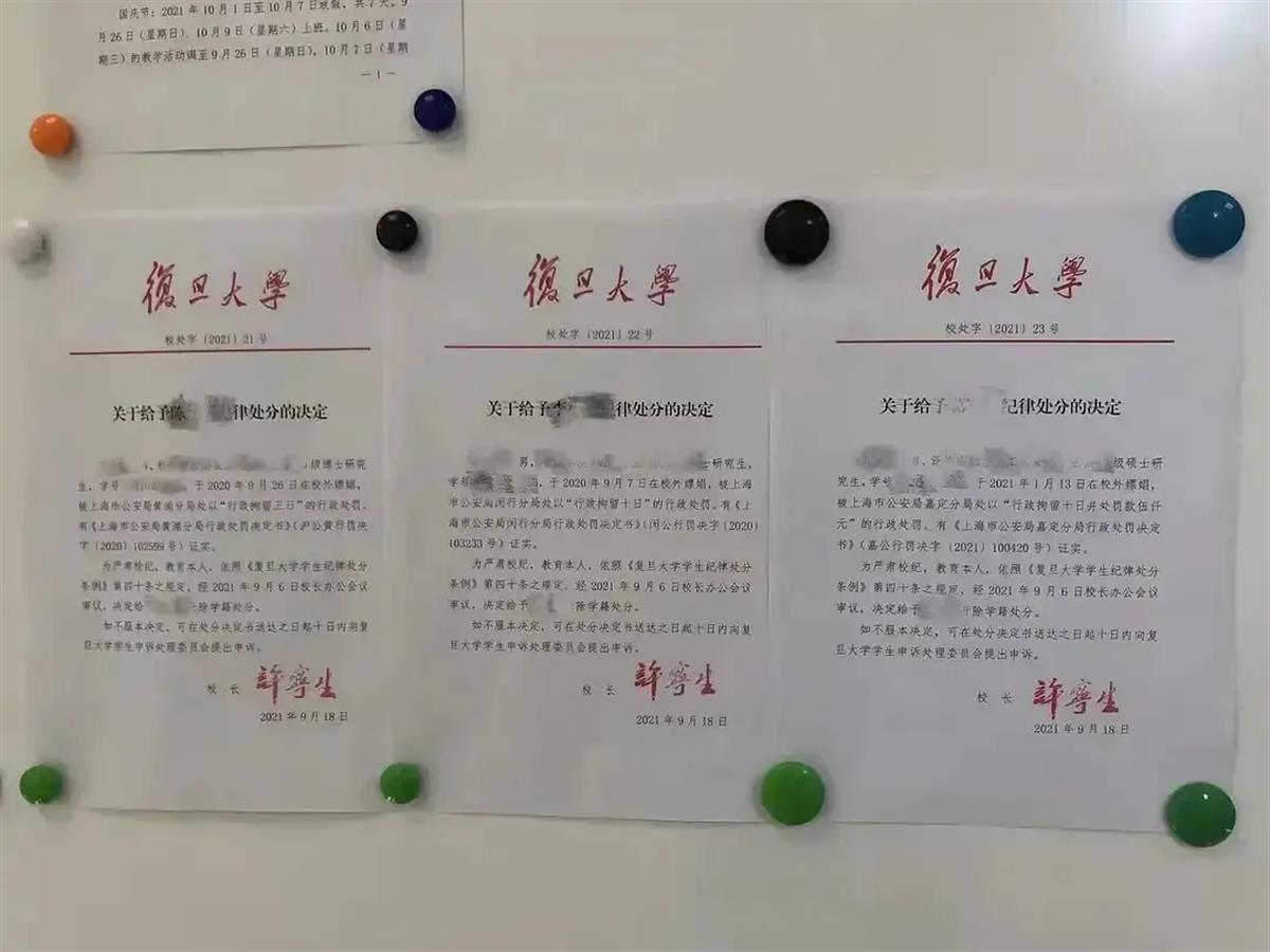 近日,网传复旦大学三份处分决定引发网络热议。处罚决定显示,三名复旦大学学生因校外嫖娼被开除学籍,其中两人分别为2019级和2020级硕士研究生,一人为2019级博士研究生。
