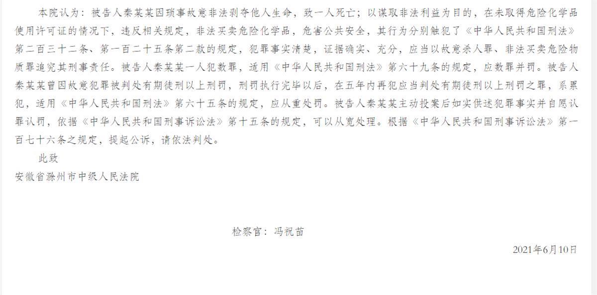 安徽省滁州市人民检察院认为:秦某某因琐事故意非法剥夺他人生命,致一人死亡;以谋取非法利益为目的,在未取得危险化学品使用许可证的情况下,违反相关规定,非法买卖危险化学品,危害公共安全,其行为分别触犯了《中华人民共和国刑法》第二百三十二条、第一百二十五条第二款的规定,犯罪事实清楚,证据确实、充分,应当以故意杀人罪、非法买卖危险物质罪追究其刑事责任。