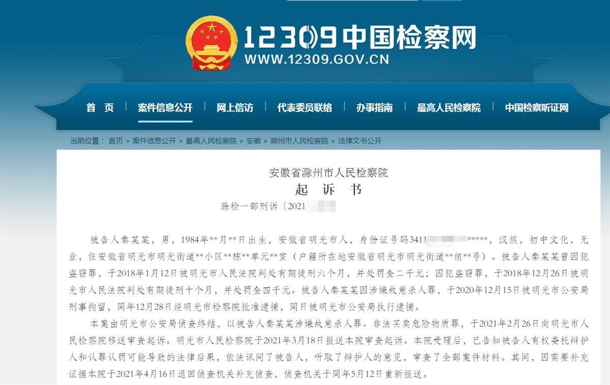 中国检察网发布的关于此案的起诉书显示,37岁的男子秦某某为安徽省明光市人,2018年曾两次因犯盗窃罪被明光市人民法院判处有期徒刑,刑期分别为6个月和10个月。