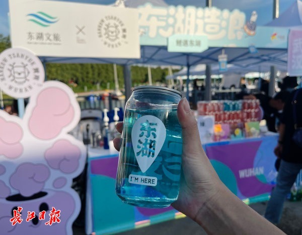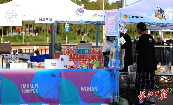 一侧,潮流市集如火如荼开展,许多武汉本土原创街头品牌都集结在此,有文创礼品、潮流服饰、特色滑板、精品咖啡等,街头艺人在此现场创作涂鸦,滑板爱好者穿梭在人群中,大秀“绝活”,武汉年轻人常打卡的凌波门也以艺术装置的形式“搬”到市集现场,吸引诸多游客打卡。东湖文旅集团推出的限定“武汉特调”系列风味气泡水也亮相市集,几乎“人手一杯”。