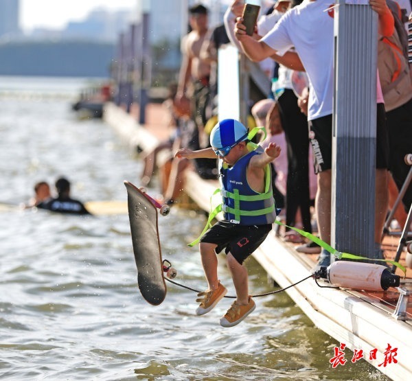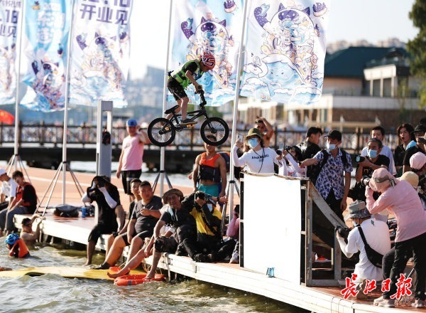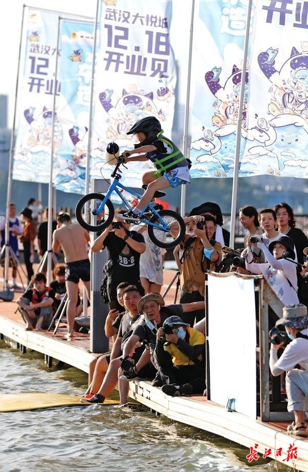下午4时,帆船基地码头准时开启“跳东湖”模式,极限车手们从百米外冲刺,攀上准备好的小缓坡后,腾空而上,进而以抛物线姿势跃入冰凉的东湖水中。众多游客及摄影爱好者手持拍摄设备,定睛等待,只为记录车手们“跳东湖”的精彩瞬间。