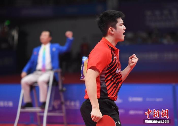 资料图:图为樊振东赢球后欢呼。 中新社记者 王刚 摄