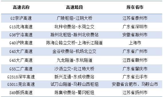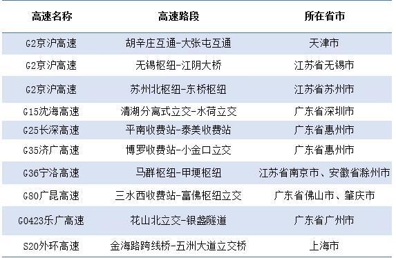 易拥堵缓行收费站。预计高速公路易拥堵缓行的收费站主要有:G3京台高速铜陵长江公路大桥收费站、G10绥满高速大庆收费站、G30连霍高速西安灞桥收费站、G65包茂高速重庆渝北收费站、G0421许广高速广州广清收费站、G1503上海绕城高速上海高东收费站、G2503南京绕城高速南京长江第三大桥高速公路收费站、G5011芜合高速芜湖长江大桥收费站、S19张家港通锡高速锦丰收费站、S21广惠高速惠州巽寮湾收费站等。