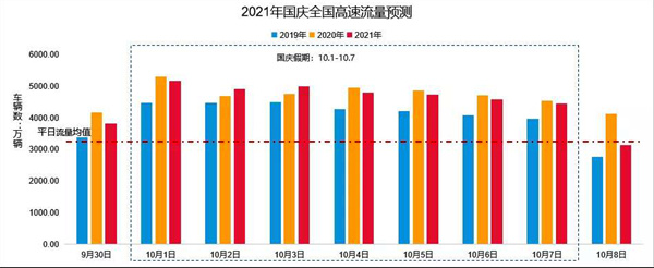 预计全国高速公路日均流量4500万辆左右,较9月上半月均值(3250.15万辆)增长47.68%,同比2020年(日均4736.43万辆)增长1.34%左右,同比2019年(日均4273.96万辆)增长12.31%左右。其中,客车日均流量预计4300万辆左右,货车日均流量预计500万辆左右。