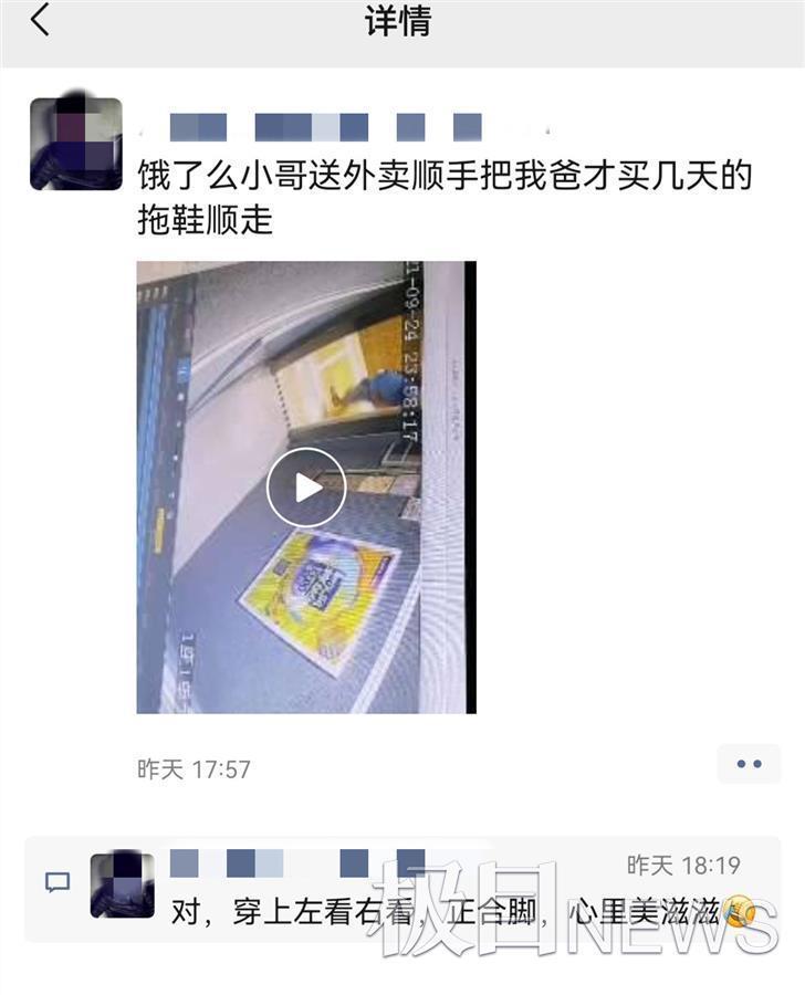 外卖骑手给隔壁房屋送餐,竟然把自家放在门口的皮凉鞋顺手偷走了,还在电梯里穿着左看右看试了试,你说这事气不气?9月26日,家住武汉经济技术开发区海伦春天小区的陈先生向极目新闻热线(027-86777777)来电反映此事,希望曝光该不文明行为。
