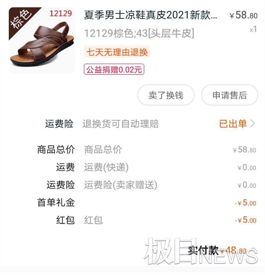 陈先生家住武汉经济技术开发区海伦春天小区。9月25日一早,他年过六旬的父亲起床准备出门,突然发现头一天晚上放在门口的皮凉鞋不见了。“我昨晚倒垃圾后上楼回家,清楚记得将皮凉鞋放在门口的,怎么会被偷呢?”父亲有些郁闷和不解。据陈先生提供的购物记录显示,这双皮凉鞋购于9月13日晚上,扣除平台优惠的10元钱,实际付款48.8元。