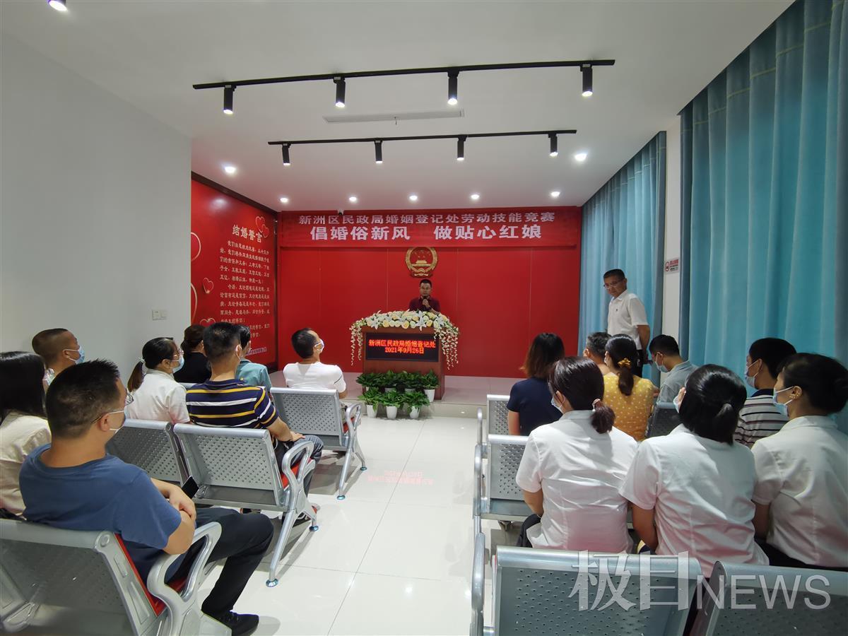 “大家好!我是新洲区民政局婚姻登记处颁证员桂兰,今天很高兴能够担任这场颁证仪式的颁证员……”9月26日,一场简单温馨的婚礼仪式在新洲区婚姻登记处举行,这是新洲区婚姻登记处劳动技能大赛的一幕。