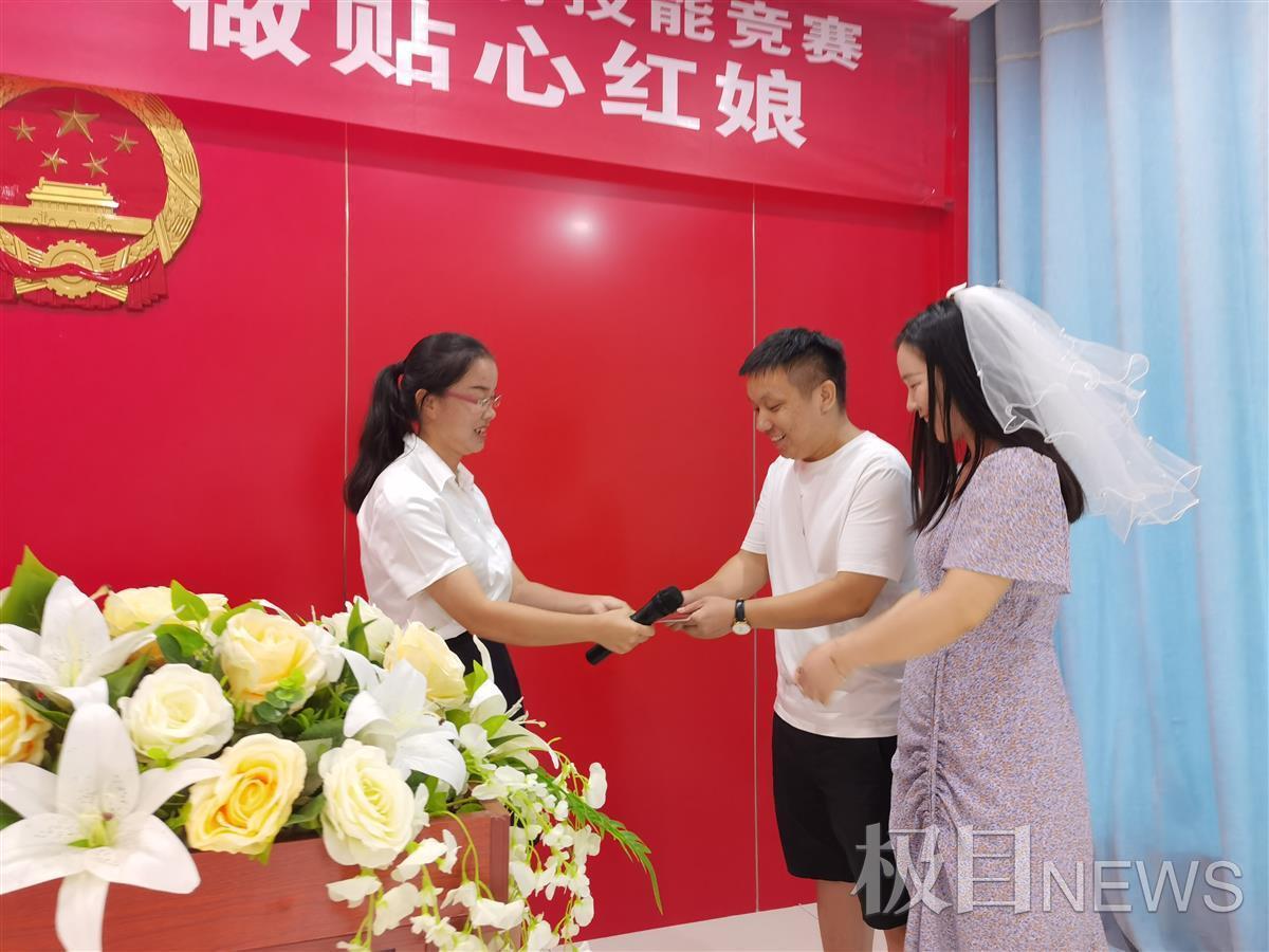“今天是2021年9月26日,这是你们一生中最值得纪念的日子。在这里,我衷心祝福你们永结同心,白头偕老。” 在颁证处,参赛的桂兰正在为一对刚办理完结婚登记的新人颁发结婚证,让这对新人体验到了婚姻登记处的“仪式感”。